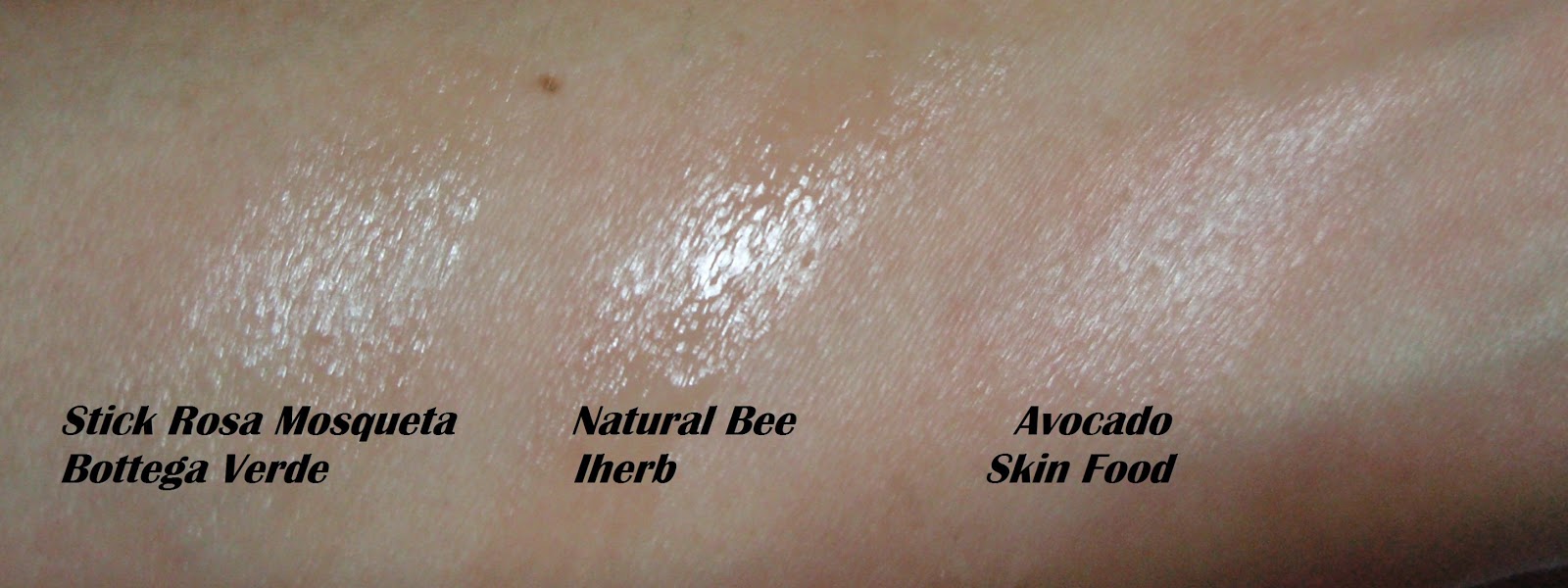 Aquí tenéis una comparación de cómo quedan estos 3 últimos que he mencionado. Como véis, el de Skin Food es bastante opaco (hay una capa bien gorda porque no salía en la foto!), el más aceitoso es el de Iherb, y el de Bottega queda como algo intermedio: